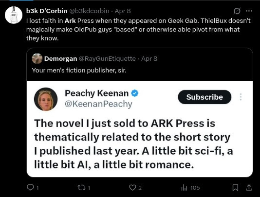 What’s tragic is that it could have worked. Linked to billionaire Peter Thiel, Ark Press had options: Buy backlists with proven demand. Aggressively back younger writers who already had readership and credibility. Or accept losses in exchange for visibility by operating as a vanity press with a mission.