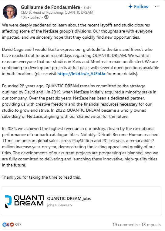 De Fondaumière responded to these rumors writing on LinkedIn, “We were deeply saddened to learn about the recent layoffs and studio closures affecting some of the NetEase group’s divisions. Our thoughts are with everyone impacted, and we sincerely hope that they quickly find new opportunities.”