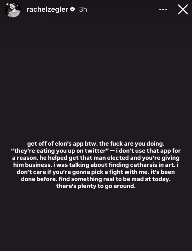 She also encouraged her followers to leave X, “get off of elon’s app btw. the f**k are you doing. ‘they’re eating you up on twitter’ - i don’t use that app for a reason. he helped get that man elected and you’re giving him business. i was talking about finding catharsis in art. i don’t care if you’re gonna pick a fight with me. it’s been done before. find something real to be mad at today. there’s plenty to go around.”