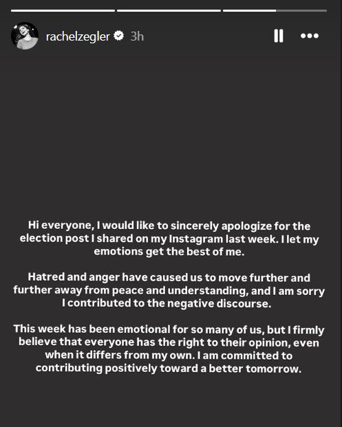 Zegler has since issued an apology. She wrote on her Instagram Stories, “Hi everyone, I would like to sincerely apologize for the election post I shared on my Instagram last week. I let my emotions get the best of me.”