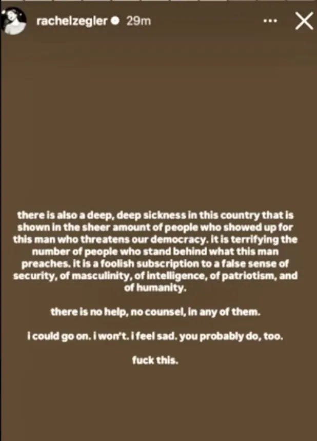 In another post, Zegler wrote, “there is also a deep, deep sickness in this country that is shown in the sheer amount of people who showed up for this man who threatens our democracy. it is terrifying the number of people who stand behind what this man preaches. it is a foolish subscription to a false sense of security, of masculinity, of intelligence, of patriotism, and of humanity.”