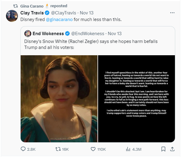 Carano seemingly shared her response to Zegler by reposting Clay Travis who wrote, “Disney fired Gina Carano for much less than this.”