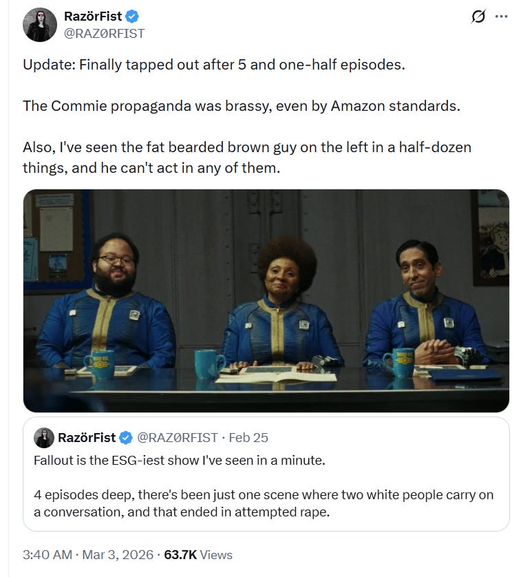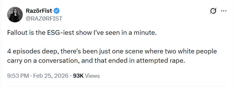 In a post to X at the end of February, RazörFist stated, “Fallout is the ESG-iest show I've seen in a minute.”