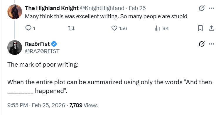 In a subsequent post he also noted the writing in the show was subpar, “The mark of poor writing: When the entire plot can be summarized using only the words ‘And then _________ happened’.”