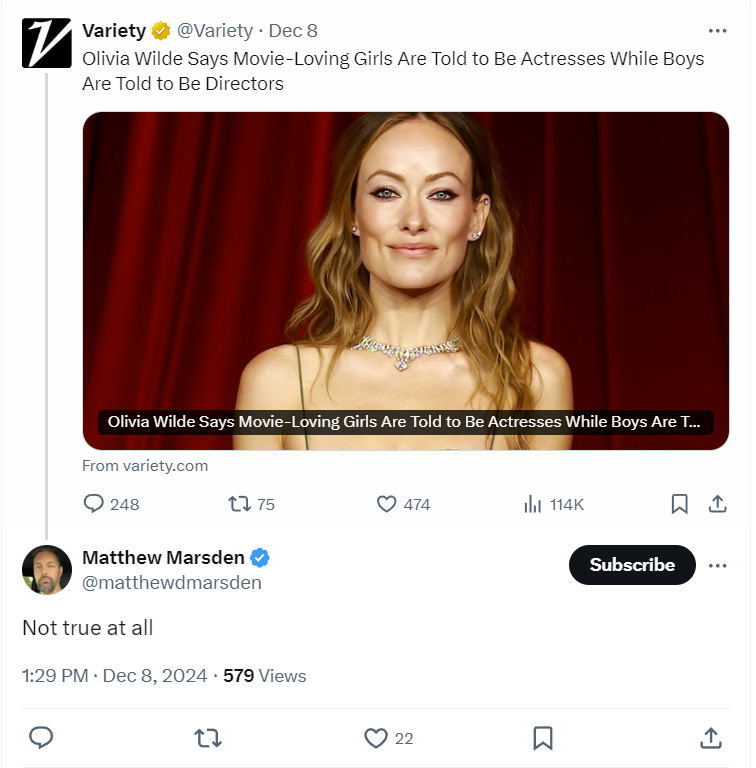 Marsden reacted to Variety’s coverage of Wilde’s comments by simply stating, “Not true at all.”
