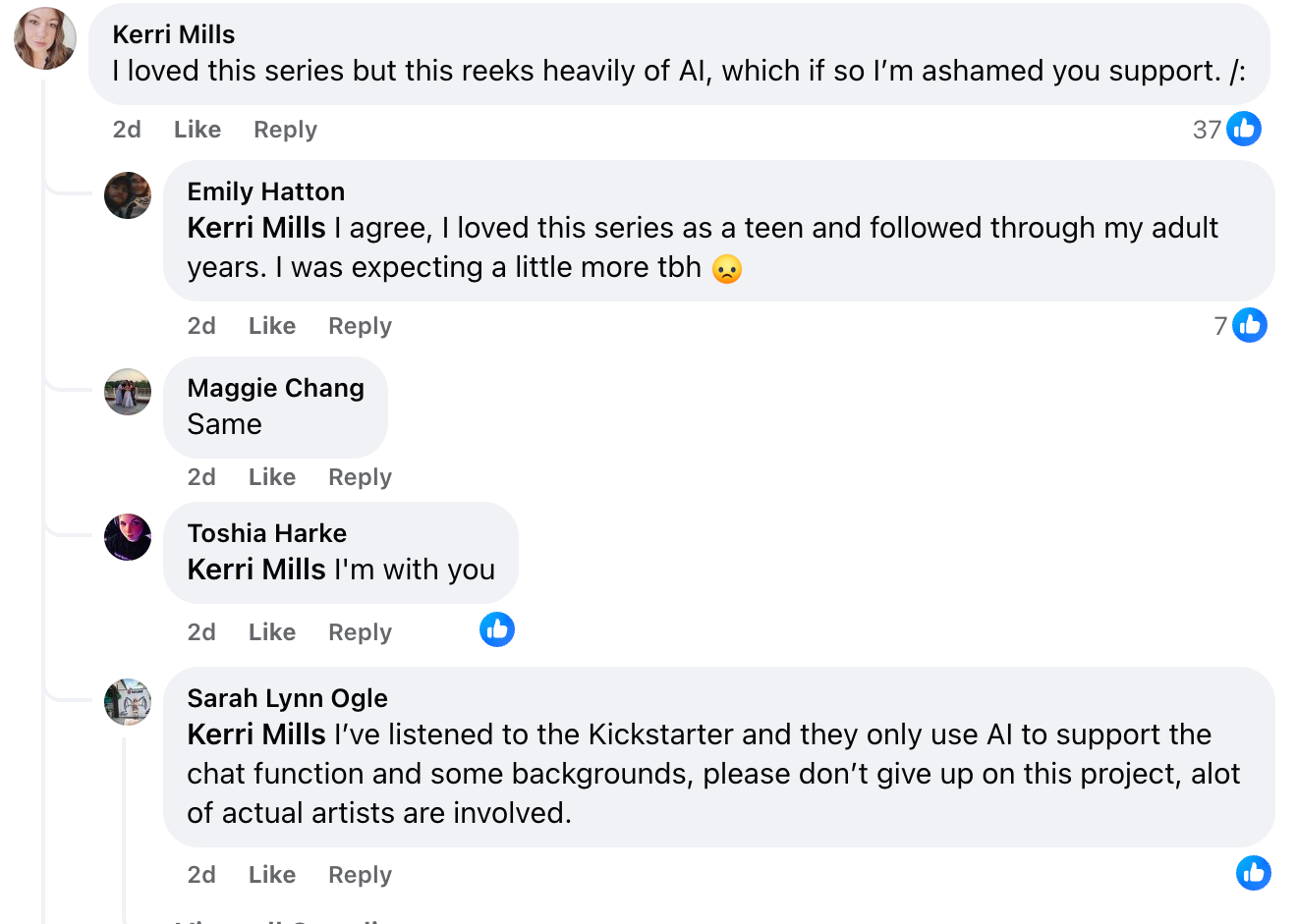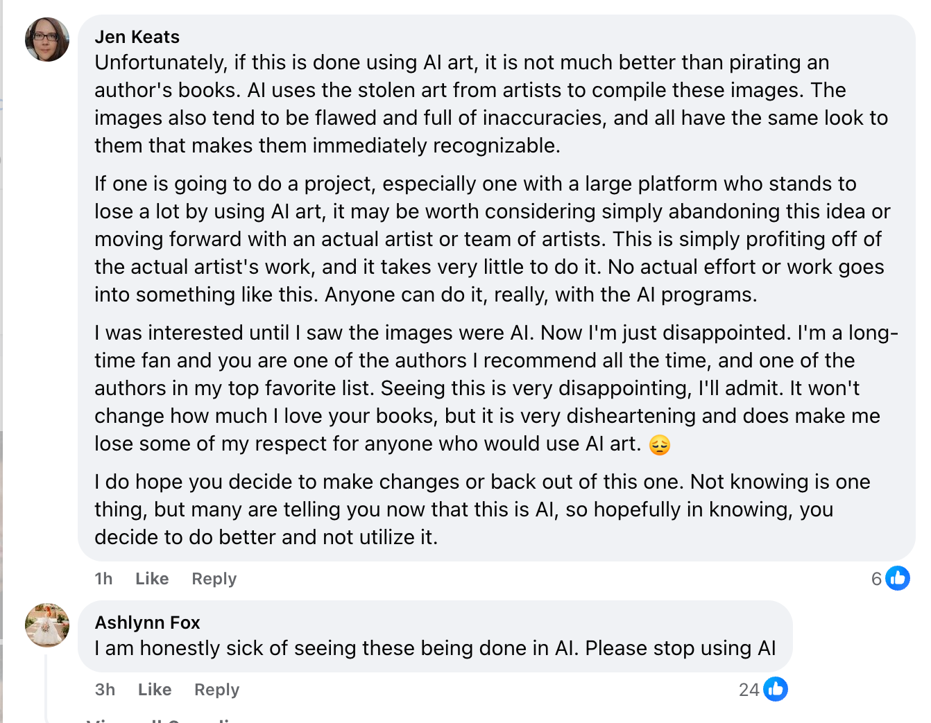 Finally one posted, “I loved this series but this reeks heavily of AI, which if so I’m ashamed you support /:”