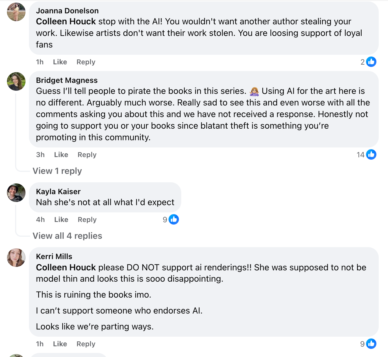 Every post Colleen Houck makes gets flooded with posts from her fans attacking her, none paying attention to what the company actually said: that these were not generated from stolen art. It seems far too many people are uninformed about AI, which is merely a tool. Like any tool, it depends on how it’s used and whether it’s ethical or not.