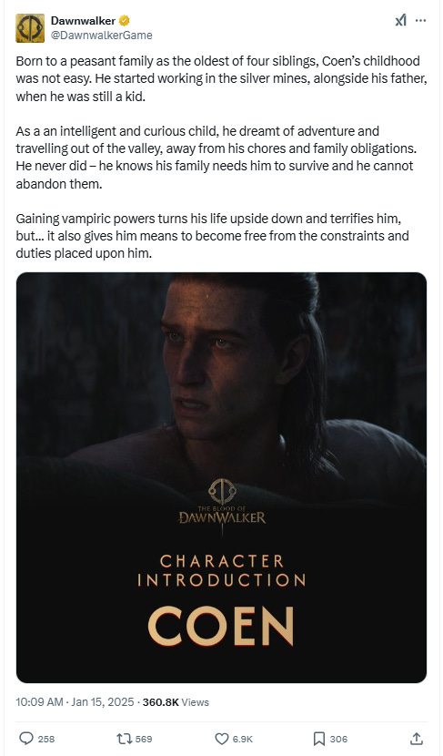 In a post to X, Rebel Wolves shared more details about Coen, “Born to a peasant family as the oldest of four siblings, Coen’s childhood was not easy. He started working in the silver mines, alongside his father, when he was still a kid.”