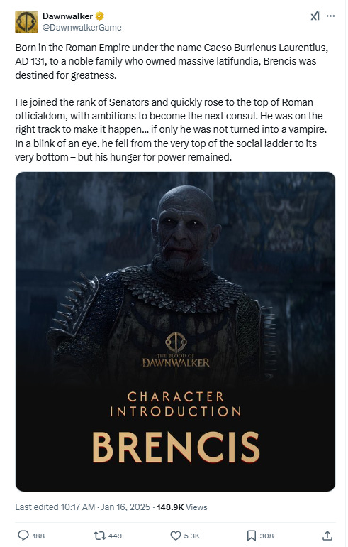 “He joined the rank of Senators and quickly rose to the top of Roman officialdom, with ambitions to become the next consul,” it continues. “He was on the right track to make it happen... if only he was not turned into a vampire. In a blink of an eye, he fell from the very top of the social ladder to its very bottom – but his hunger for power remained.”