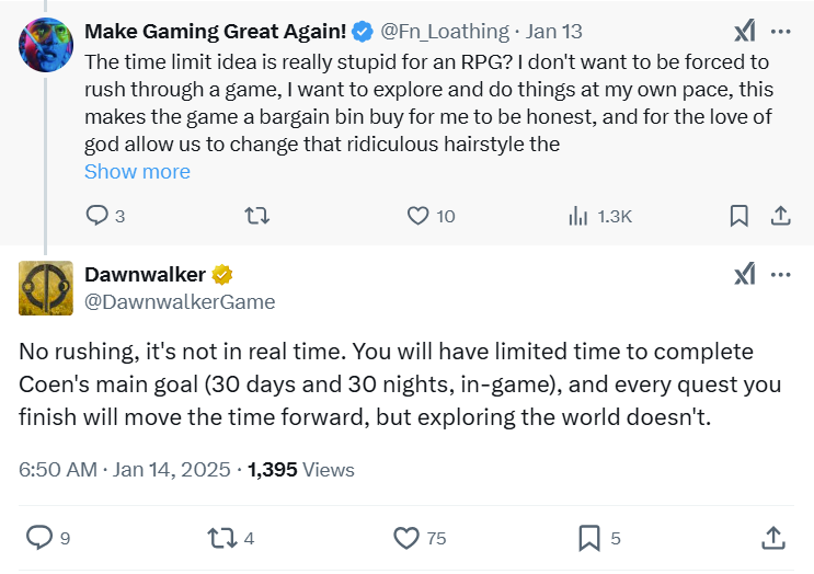 Rebel Wolves responded, “No rushing, it's not in real time. You will have limited time to complete Coen's main goal (30 days and 30 nights, in-game), and every quest you finish will move the time forward, but exploring the world doesn't.”