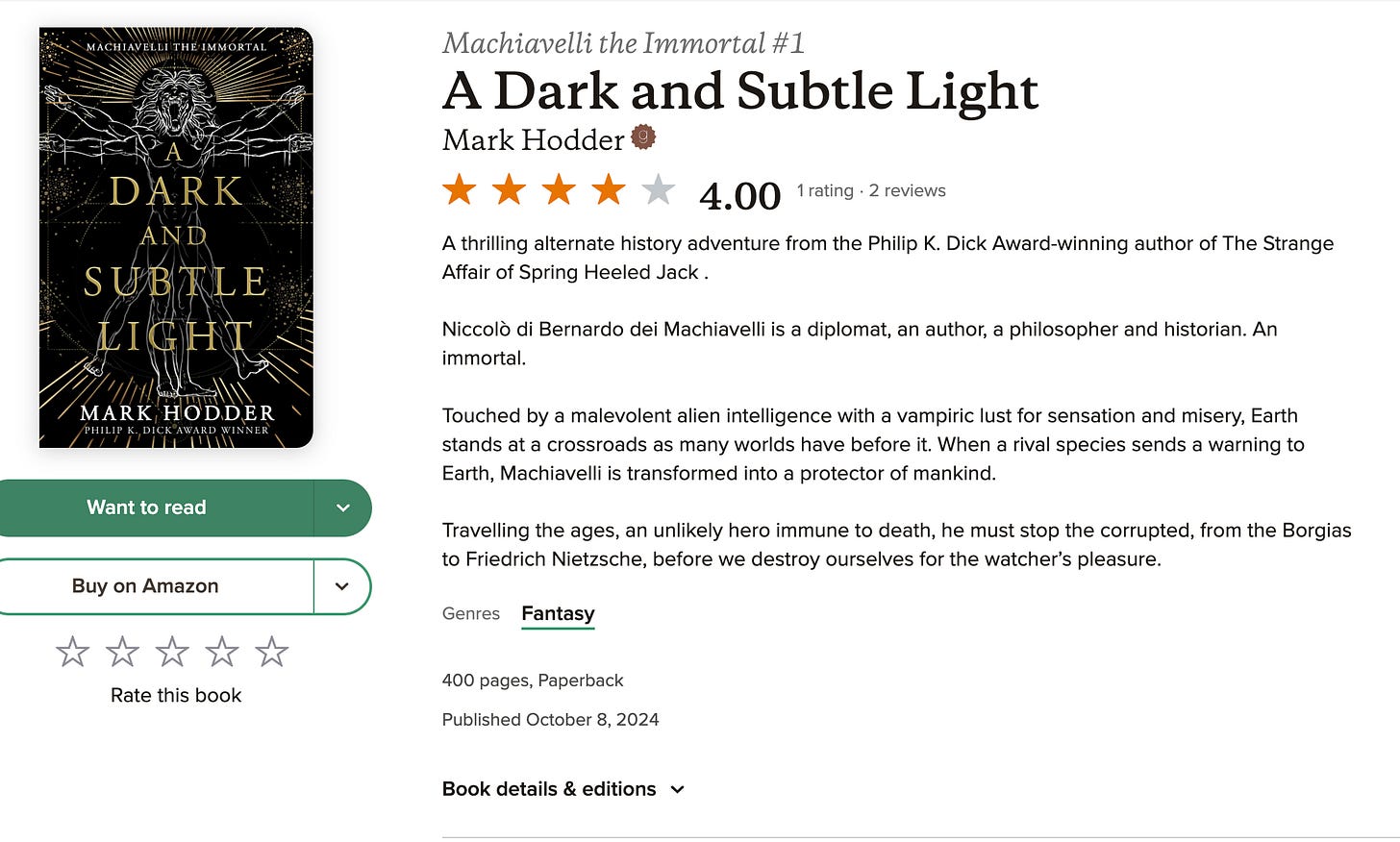 Mark Hodder has been a science fiction writer working professionally in the field since 2008, winning the Phillip K. Dick award for his The Strange Affair of Spring-Heeled Jack in 2010, and fans were excited about his new book, A Dark And Subtle Light which was supposed to release in October 2024.