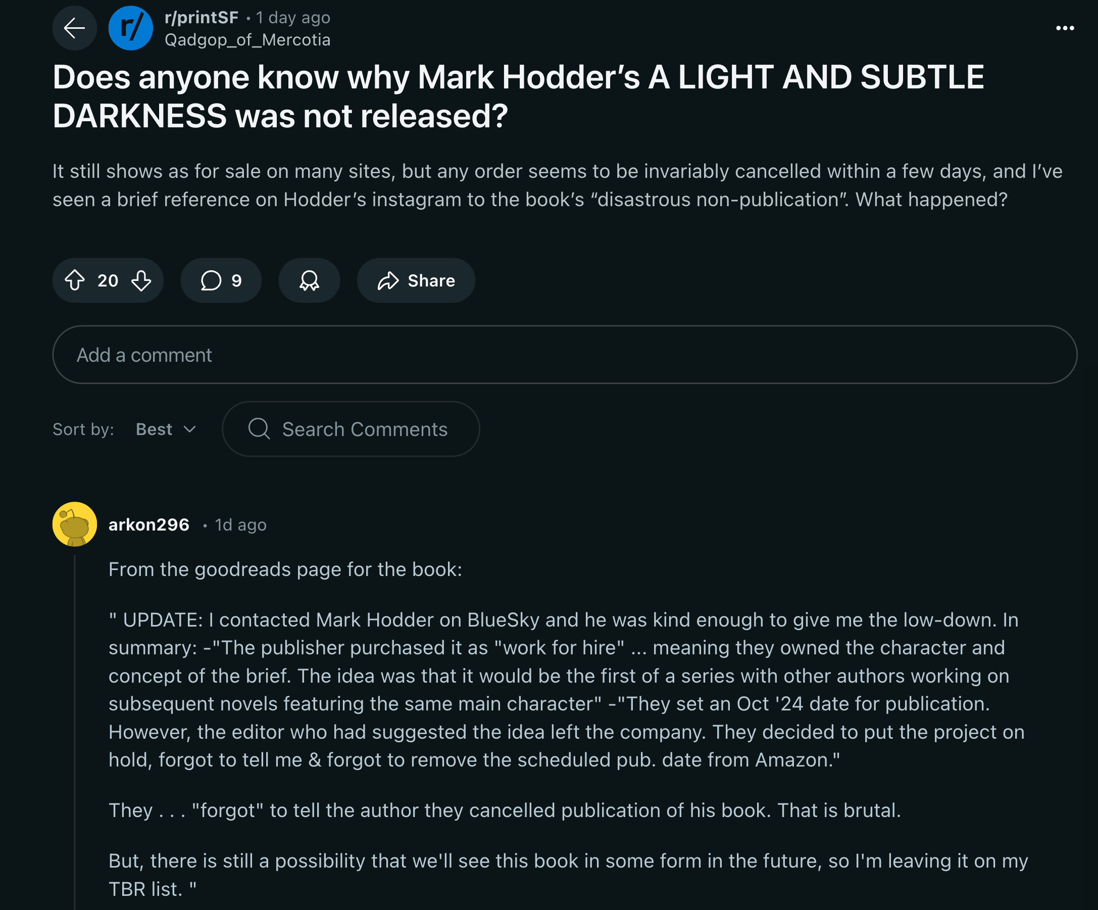 One fan posed the question, “Does anyone know why Mark Hodder’s A LIGHT AND SUBTLE DARKNESS was not released? It still shows as for sale on many sites, but any order seems to be invariably cancelled within a few days, and I’ve seen a brief reference on Hodder’s instagram to the book’s ‘disastrous non-publication’. What happened?”