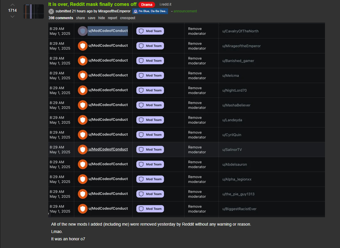 He wrote, “All of the new mods I added (including me) were removed yesterday by Reddit without any warning or reason. Lmao. It was an honor o7.”