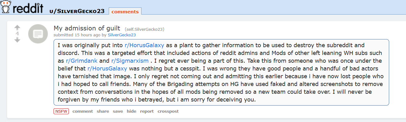 In a post, the user wrote, “I was originally put into HorusGalaxy as a plant to gather information to be used to destroy the subreddit and discord. This was a targeted effort that included actions of reddit admins and Mods of other left leaning WH subs such as Grimdank and Sigmarxism.”