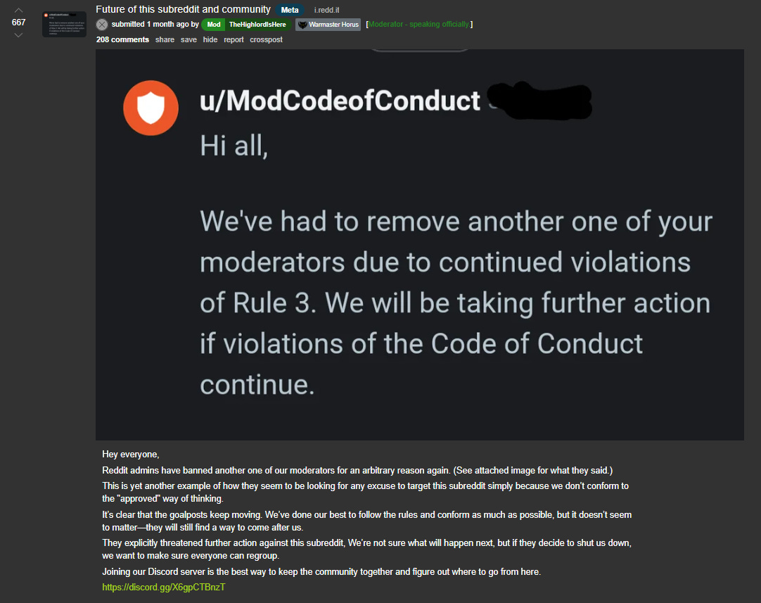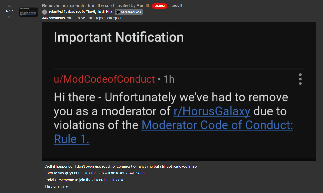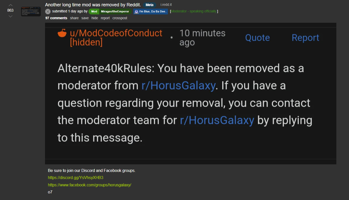 Two weeks later and he reported that he had been removed as a moderator from the subreddit due to an alleged violation of Moderator Code of Conduct Rule 1, “Well it happened, I don't even use reddit or comment on anything but still got removed lmao. sorry to say guys but I think the sub will be taken down soon, I advise everyone to join the discord just in case. This site sucks.”