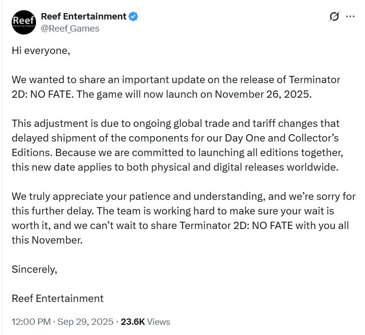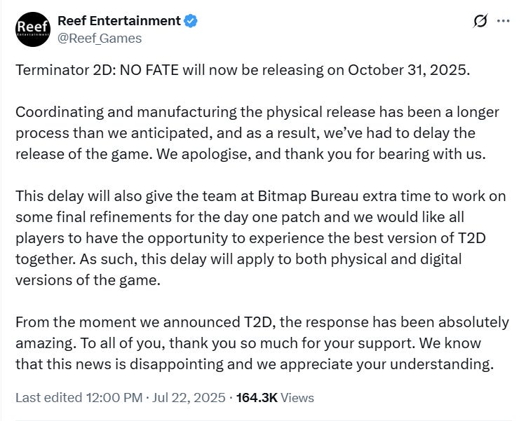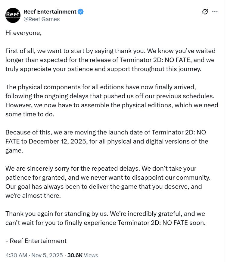 “Because of this, we are moving the launch date of Terminator 2D: NO FATE to December 12, 2025, for all physical and digital versions of the game,” the company added. “We are sincerely sorry for the repeated delays. We don’t take your patience for granted, and we never want to disappoint our community. Our goal has always been to deliver the game that you deserve, and we’re almost there.”