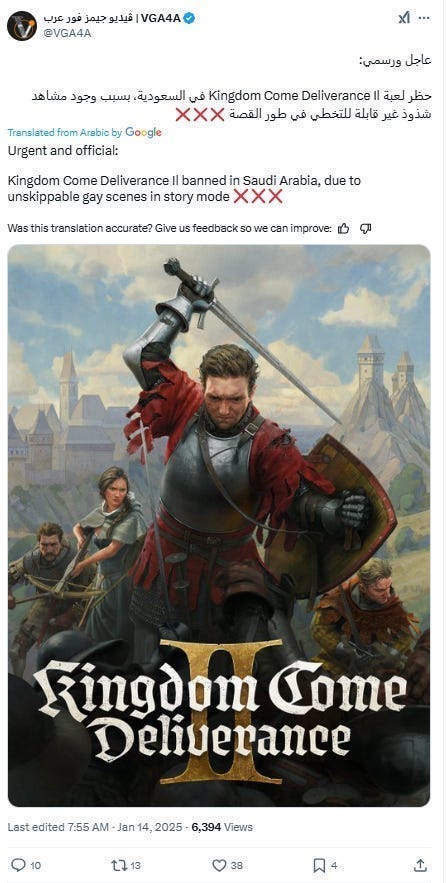 That rumor was reported by VGA4A on X, “Urgent and official: Kingdom Come Deliverance II banned in Saudi Arabia, due to unskippable gay scenes in story mode.”