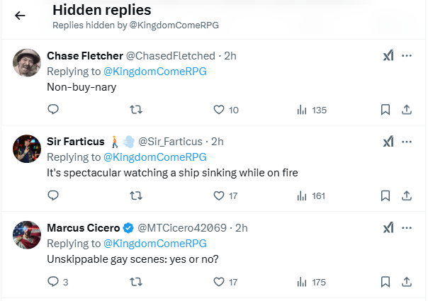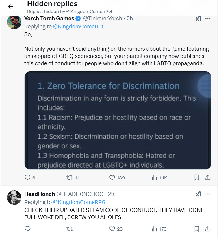 Some hidden replies include one from Yorch Torch Games, who wrote, “So, Not only you haven't said anything on the rumors about the game featuring unskippable LGBTQ sequences, but your parent company now publishes this code of conduct for people who don't align with LGBTQ propaganda.”