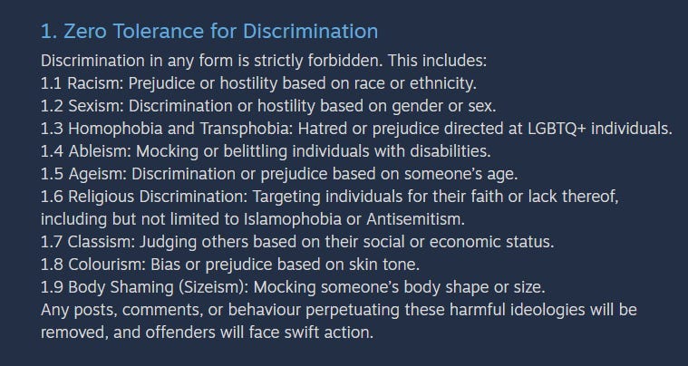 Another states, “CHECK THEIR UPDATED STEAM CODE OF CONDUCT, THEY HAVE GONE FULL WOKE DEI , SCREW YOU AHOLES.”