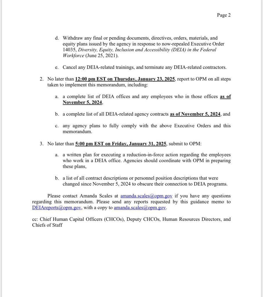 Following the issuance of this executive order a memorandum from the United States Office of Personnel Management instructs offices and agency sub-units to shut down DEIA offices. Specifically it states that agency heads “send an agency-wide notice to employees informing them of the closure and asking employees if they know of any efforts to disguise these programs by using coded or imprecise language.”