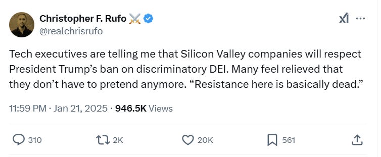 In response to these orders, political commentator and activist Christopher Rufo shared that “Tech executives are telling me that Silicon Valley companies will respect President Trump’s ban on discriminatory DEI.”