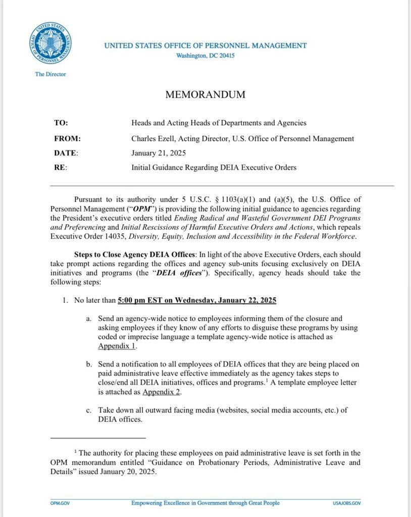 Next, it states to “send notifications to all employees of DEIA offices that they are being placed on paid administrative leave effective immediately as the agency takes steps to close/end all DEIA initiatives, offices, and programs.