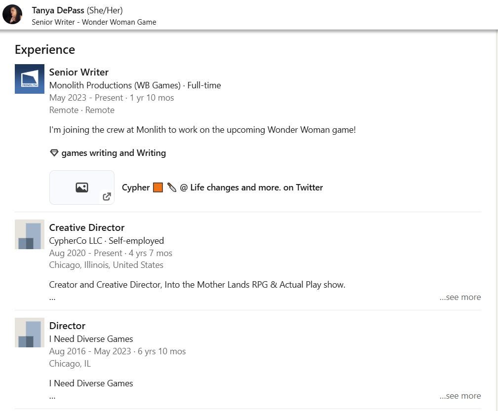 DePass’ LinkedIn notes she is still working at Monolith Productions on the Wonder Woman game.
