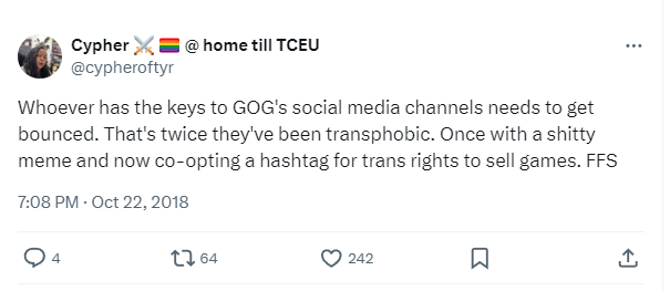 DePass posted to X, “Whoever has the keys to GOG’s social media channels needs to get bounced. That’s twice they’ve been transphobic. Once with a shitty meme and now co-opting a hashtag for trans rights to sell games. FFS”
