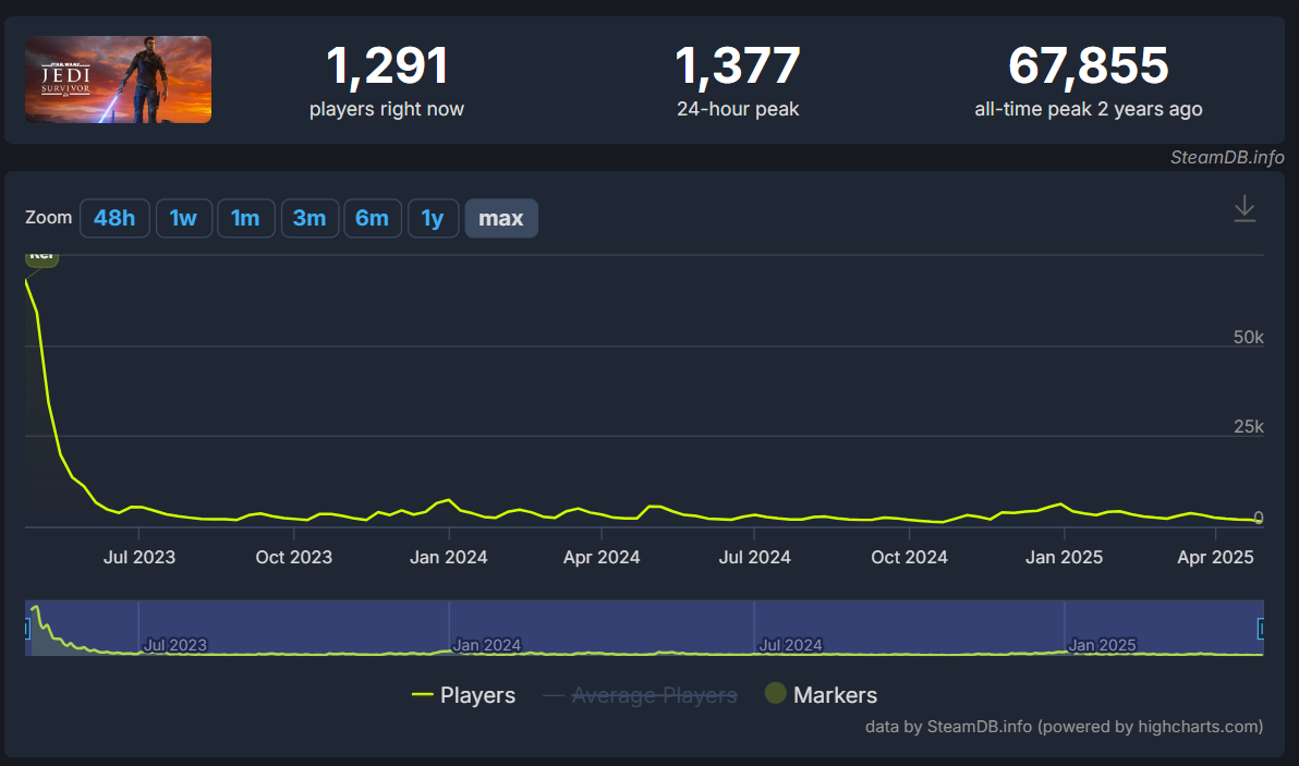 Star Wars Jedi: Survivor hit an all-time peak concurrent player count of 67,855 back in 2023 when it released.