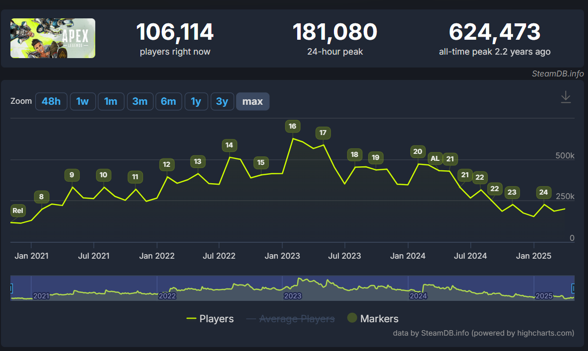 Apex Legends is still one of the most popular games on Steam. In the last 24 hours it hit a peak concurrent of 181,080 players, which was good for the game with the fourth highest peak concurrent players behind Counter-Strike 2, PUBG: Battlegrounds, and Dota 2.