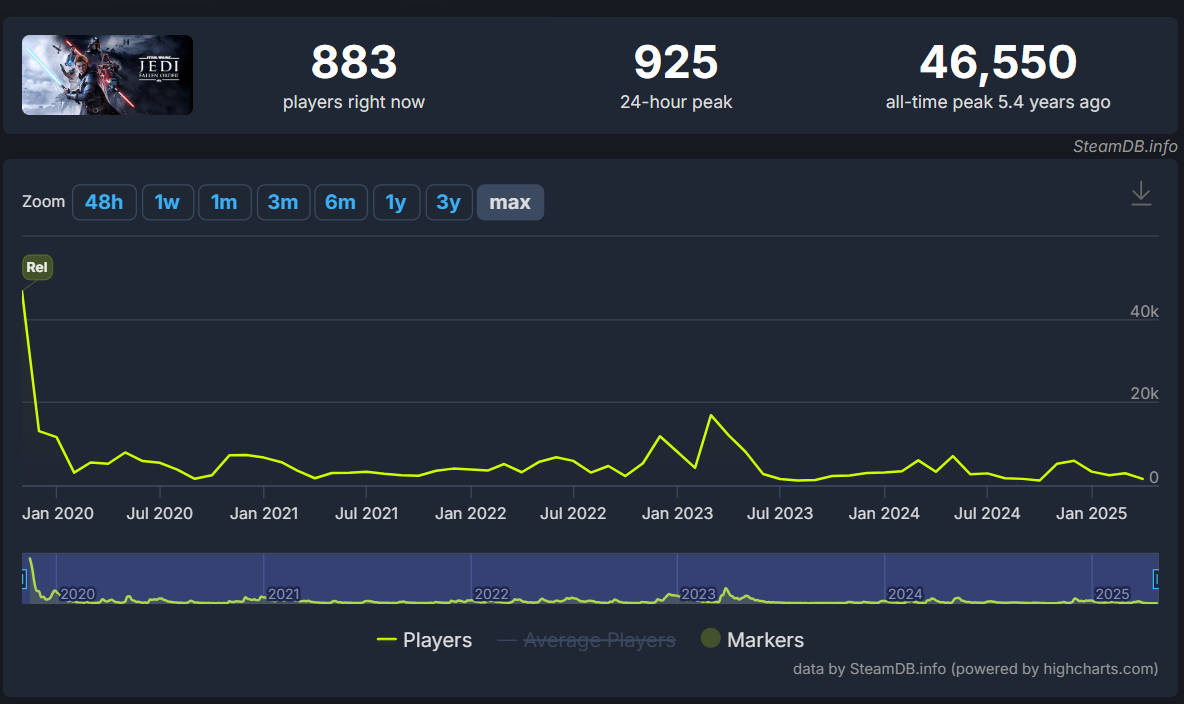 As for Star Wars Jedi: Fallen Order, the 2019 game hit a peak concurrent of 46,550 on Steam when it released.