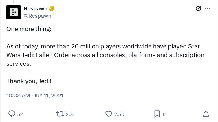 Respawn would announced in June 2021 that the game had achieved 20 million players “across all consoles, platforms, and subscription services.”