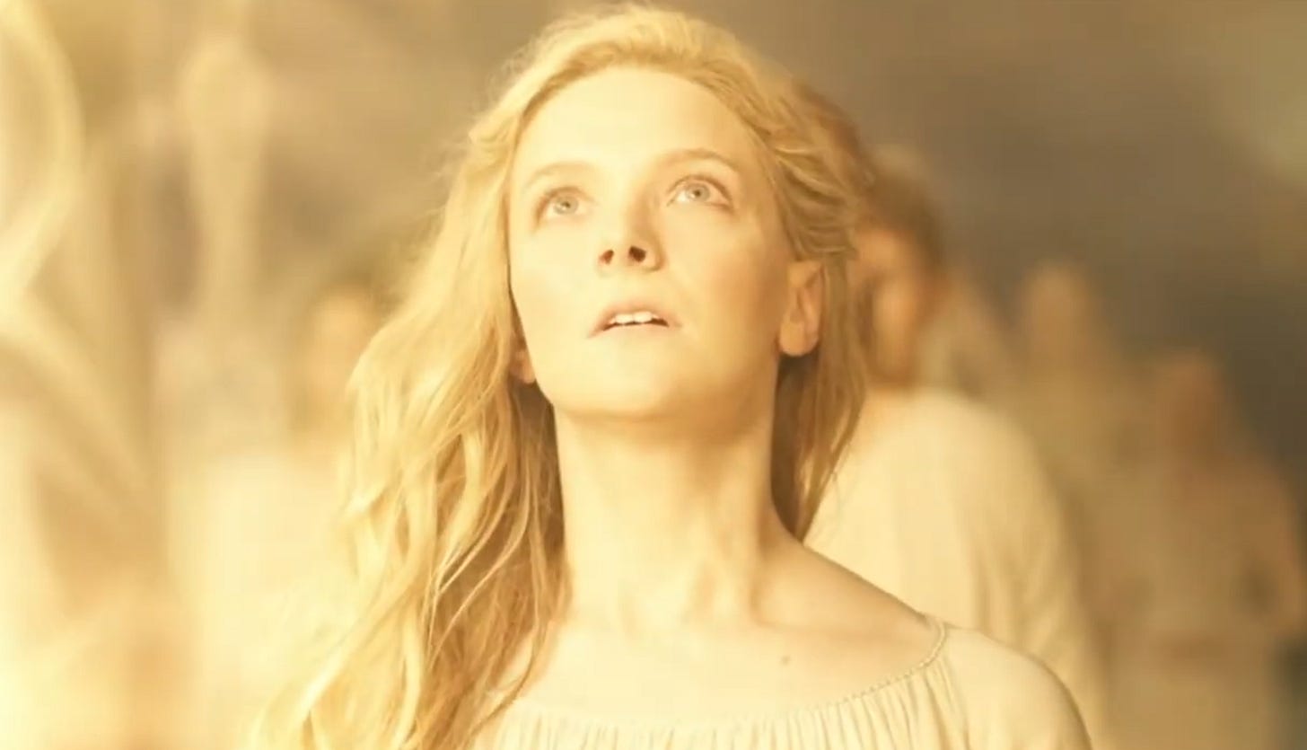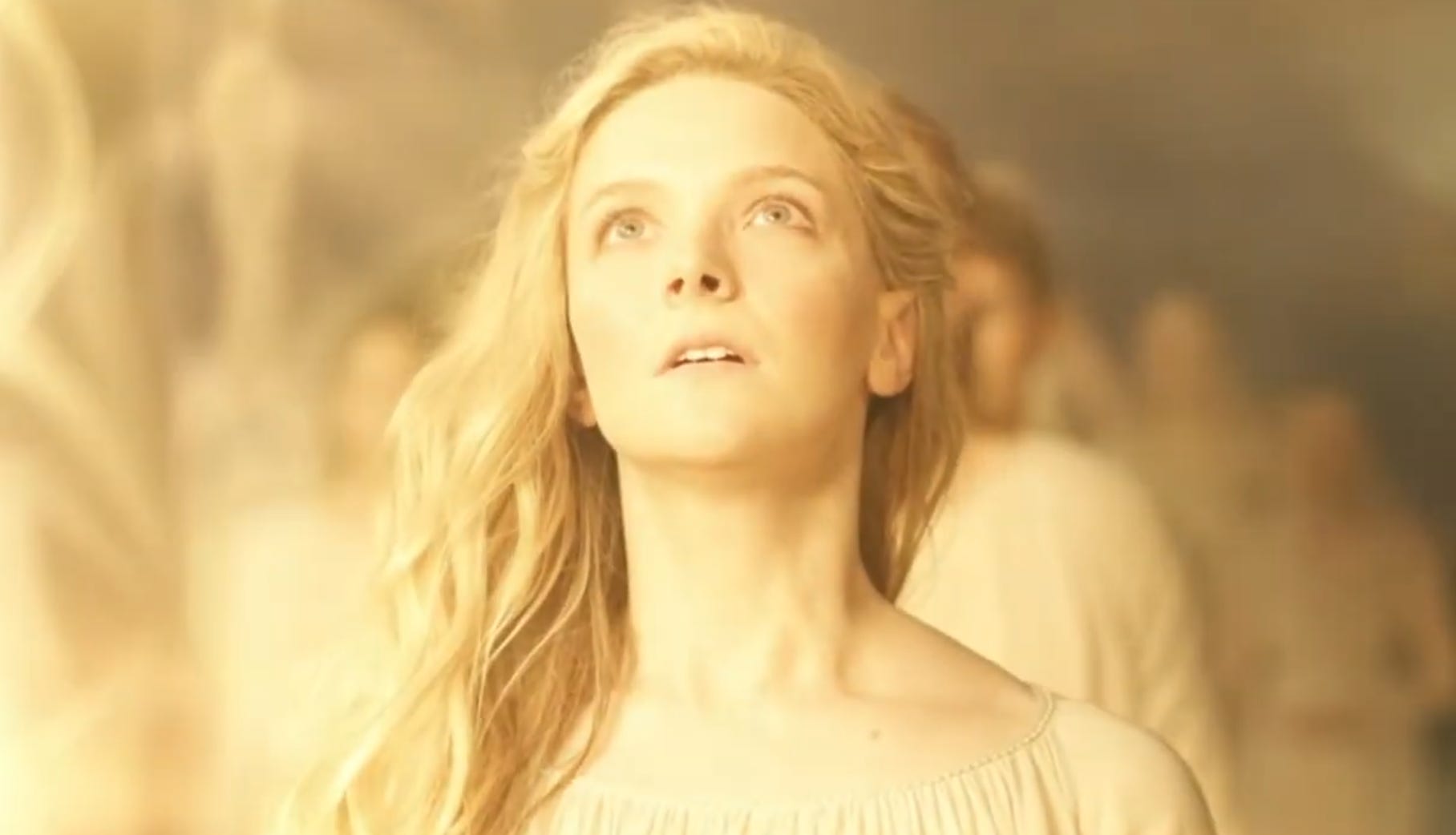 In the scene, which you can see below, Galadriel and a number of other Elves arrive at Valinor and begin hearing pleasant music and see a flock of birds begin to encircle them. The other Elves on the boat begin singing the pleasant music as Galadriel looks around puzzled.
