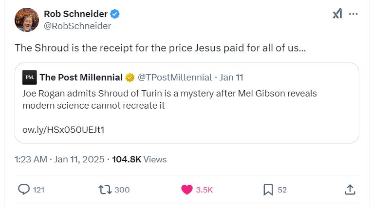 Rob Schneider reacted to The Post Millennial’s coverage of Rogan and Gibson’s discussion surrounding the Shroud writing on X, “The Shroud is the receipt for the price Jesus paid for all of us…”
