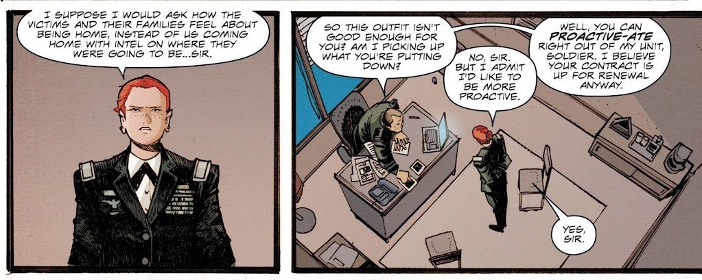 It gets worse in Scarlett, written by industry darling Kelly Thompson, who’s being held up as one of the new mold of feminists in the industry. Scarlett is portrayed as insubordinate to the male leadership in the military, but she’s “right” making her a cringy girl boss Mary Sue in her adventure so far.