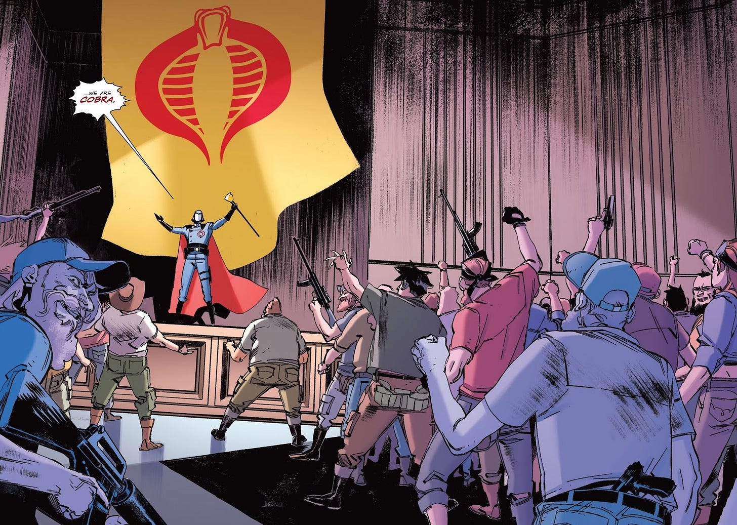 Joshua Williamson, the writer who lambasted Eric July and Alex Jones in a recent DC Comic, was tapped to write the Cobra Commander comic. This comic featured the origin of Cobra Commander and his ascent into leadership. While the first four issues were action-packed fun, the end of issue #5 revealed an agenda in a panel where the evil character is rallying people for his cause. One might note how that looks: