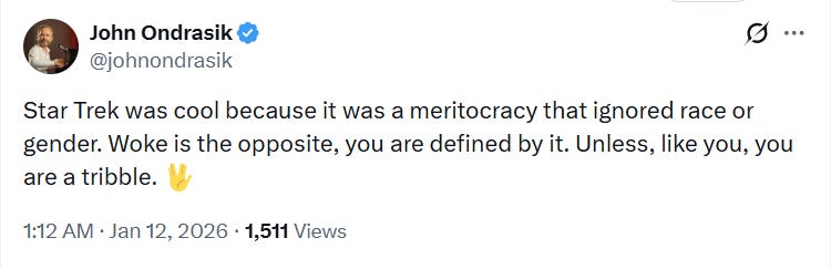 “Star Trek was cool because it was a meritocracy that ignored race or gender. Woke is the opposite, you are defined by it. Unless, like you, you are a tribble,” wrote John Ondrasik.