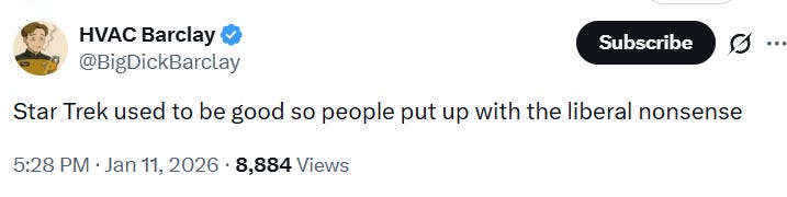 HVAC Barclay posted, “Star Trek used to be good so people put up with the liberal nonsense”