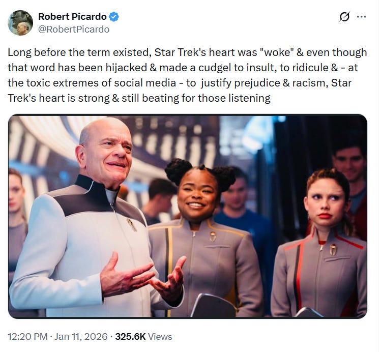 In a post to X, Picardo posted, “Long before the term existed, Star Trek's heart was "woke" & even though that word has been hijacked & made a cudgel to insult, to ridicule & - at the toxic extremes of social media - to justify prejudice & racism, Star Trek's heart is strong & still beating for those listening.”