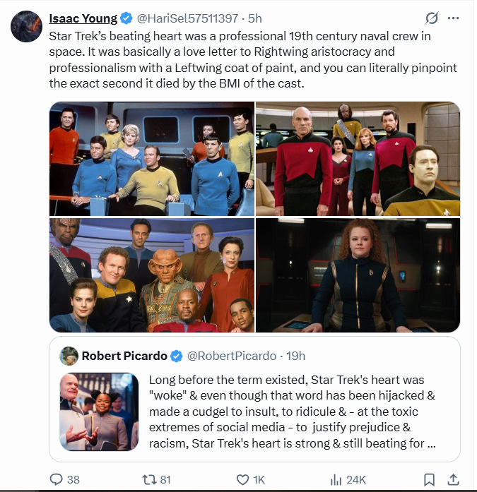 The Domes of Calrathia author Isaac Young also responded writing, “Star Trek’s beating heart was a professional 19th century naval crew in space. It was basically a love letter to Rightwing aristocracy and professionalism with a Leftwing coat of paint, and you can literally pinpoint the exact second it died by the BMI of the cast.”