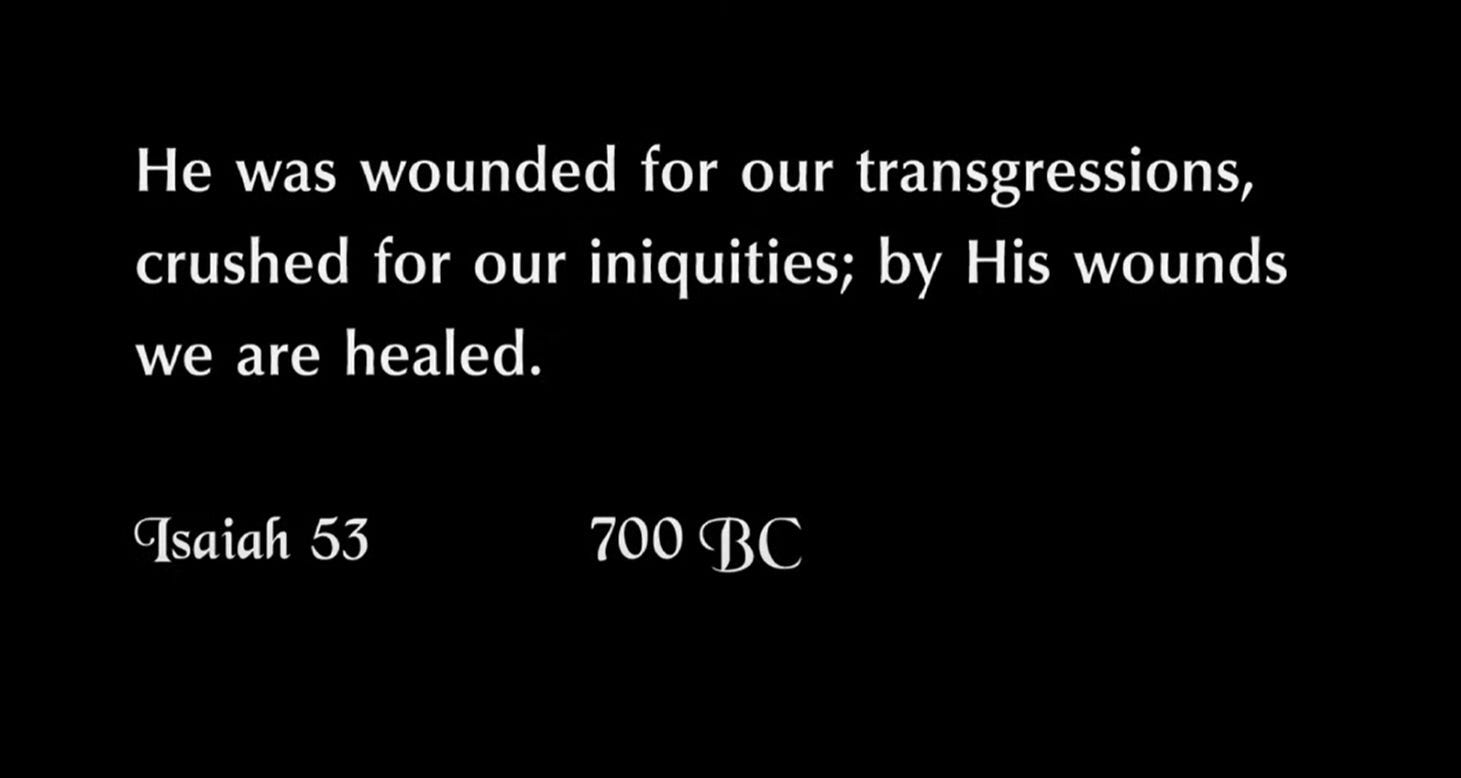 The Scripture passage that is shown at the beginning of the film is from Isaiah 53:5 and reads, “He was wounded for our transgressions, crushed for our iniquities, by His wounds we are healed.”