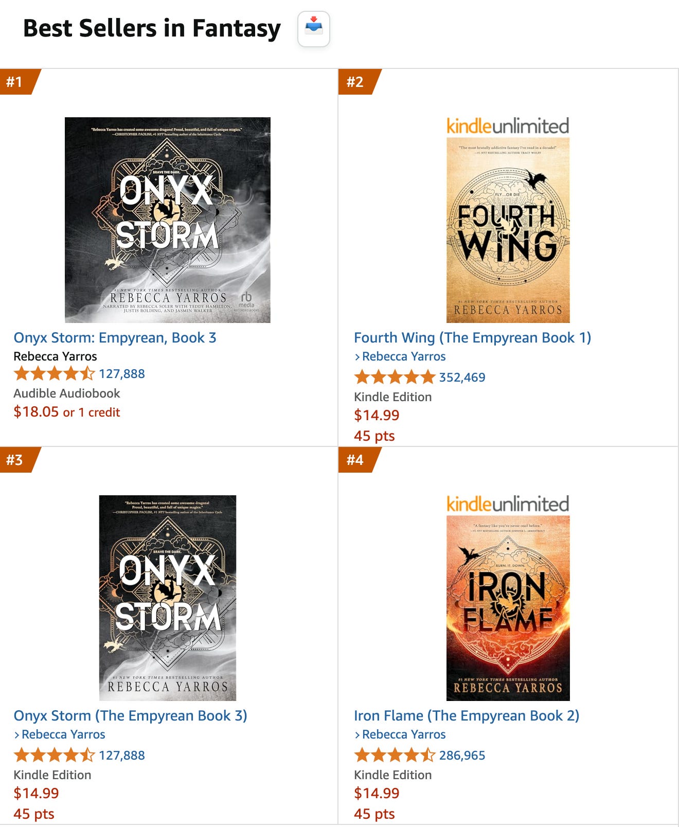 As of this writing, Rebecca Yarros currently holds seven of the top ten slots of the Amazon charts for bestselling Fantasy, with her print, ebooks, and audio all selling at incredible numbers.