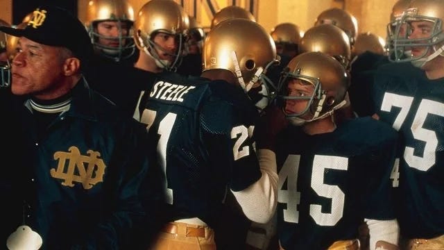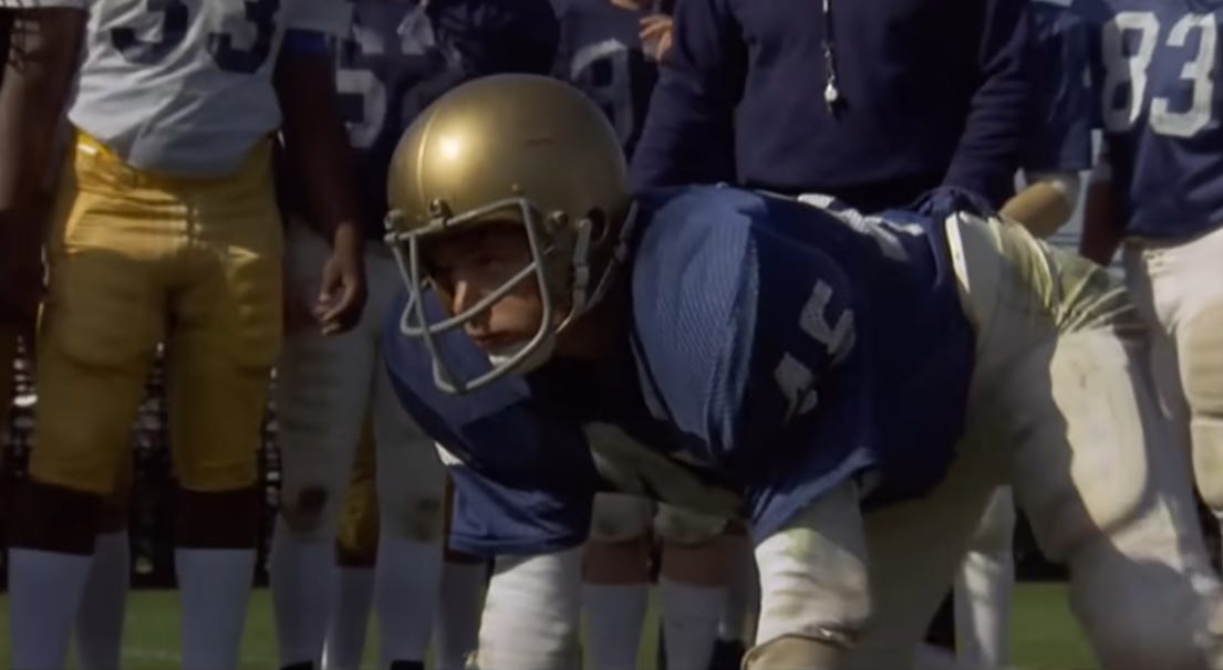 Rudy Ruettiger’s story hits all the familiar beats: a working-class kid from nowhere dreams of playing football for Notre Dame despite lacking size, talent, and academic standing. Through grit and persistence, he finally gets accepted, joins the team as a walk-on, and, in the climax, gets to take part in one play in a single game.