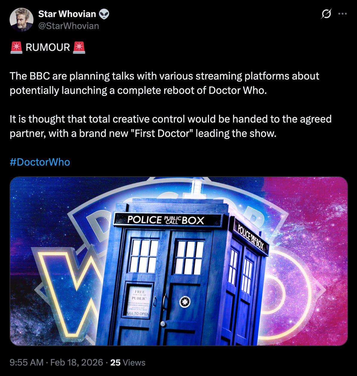 “The BBC are planning talks with various streaming platforms about potentially launching a complete reboot of Doctor Who,” Star Whovian posted to X. “It is the thought that total creative control would be handed to the agreed partner with a brand new ‘First Doctor’ leading the show.”