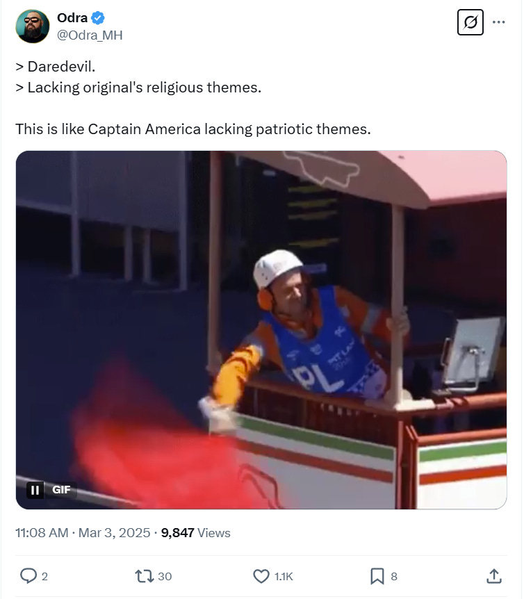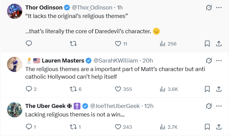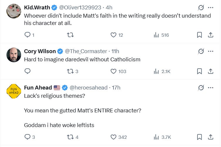 Thor_Odinson wrote, “‘It lacks the original’s religious themes’ …that’s literally the core of Daredevil’s character.”