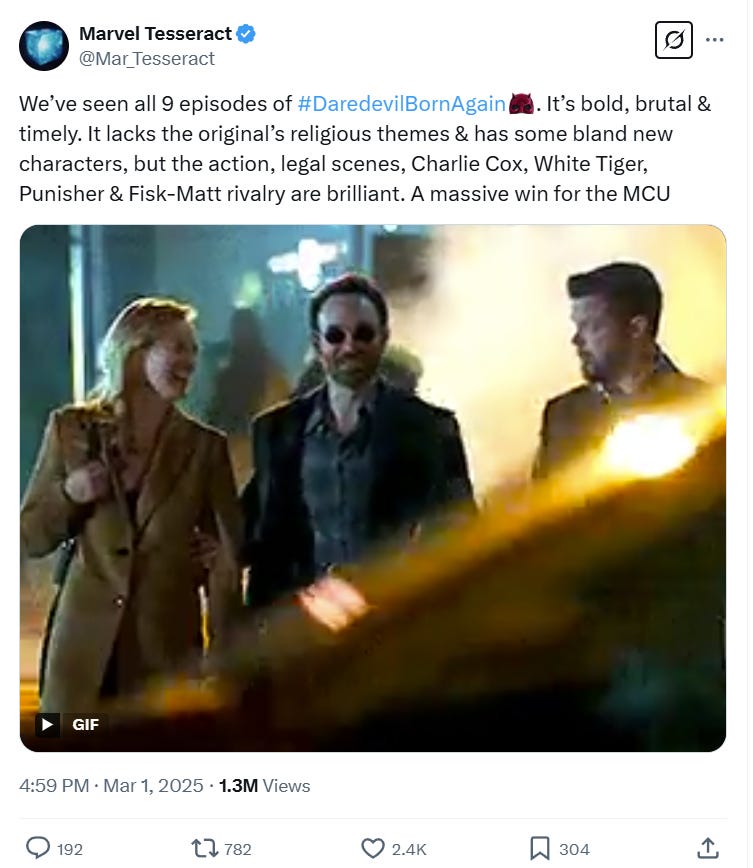 The user wrote, “We’ve seen all 9 episodes of Daredevil: Born Again. It’s bold, brutal & timely. It lacks the original’s religious themes & has some bland new characters, but the action, legal scenes, Charlie Cox, White Tiger, Punisher & Fisk-Matt rivalry are brilliant. A massive win for the MCU.”