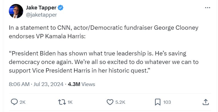 Jake Tapper on X reported, “In a statement to CNN, actor/Democratic fundraiser George Clooney endorses VP Kamala Harris: ‘President Biden has shown what true leadership is. He’s saving democracy once again. We’re all so excited to do whatever we can to support Vice President Harris in her historic quest.’”