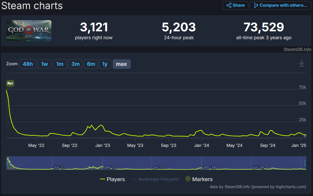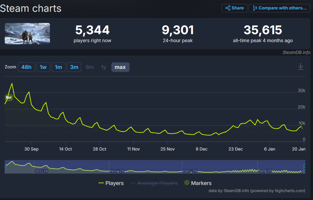 The God of War brand might not be as popular as what Sony might have initially thought. God of War Ragnarok released to Steam in September and only hit a peak concurrent of 35,615 players.