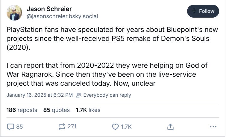 He wrote, “I can report that from 2020-2022 [Bluepoint Games] were helping on God of War Ragnarok. Since then they've been on the live-service project that was canceled today. Now, unclear.”