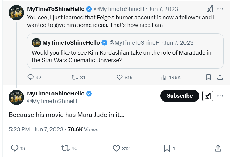 He wrote back in 2023, “You see, I just learned that Feige's burner account is now a follower and I wanted to give him some ideas. That's how nice I am.